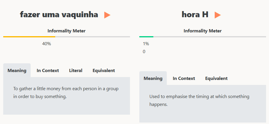 Did you know that in The Journey, you get a section full of colloquial sayings and expressions? This feature, called Not in the Textbook, is included in your subscription. It helps you learn dozens of Portuguese sayings, along with their meaning, pronunciation, literal translation, and English equivalent. We even added an informality meter so you can know exactly when and how to use each phrase.