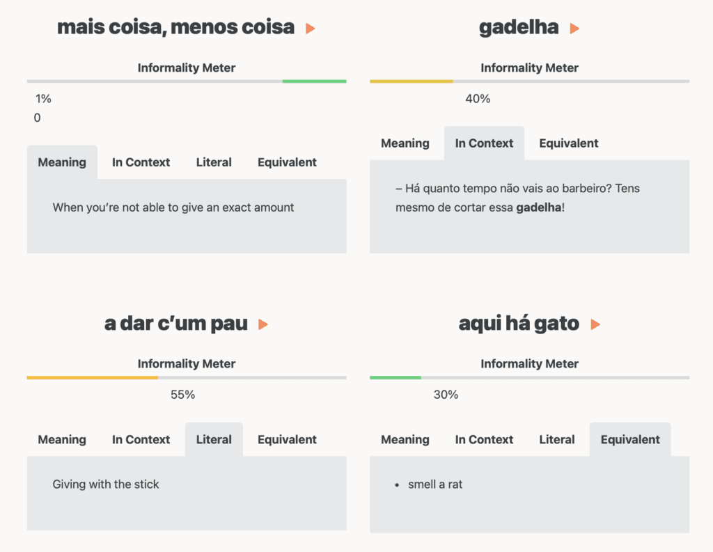 Throughout the lessons, you will be exposed to expressions like the ones in this article. You will also get access to a special idioms section on the site. Each includes the audio in European Portuguese, an English equivalent, a brief explanation, and usage examples. There is even a scale to show how informal or slang-like the expression is. This way, you will not only learn these sentences, but you will know how to apply them correctly. Click the link below to learn more!