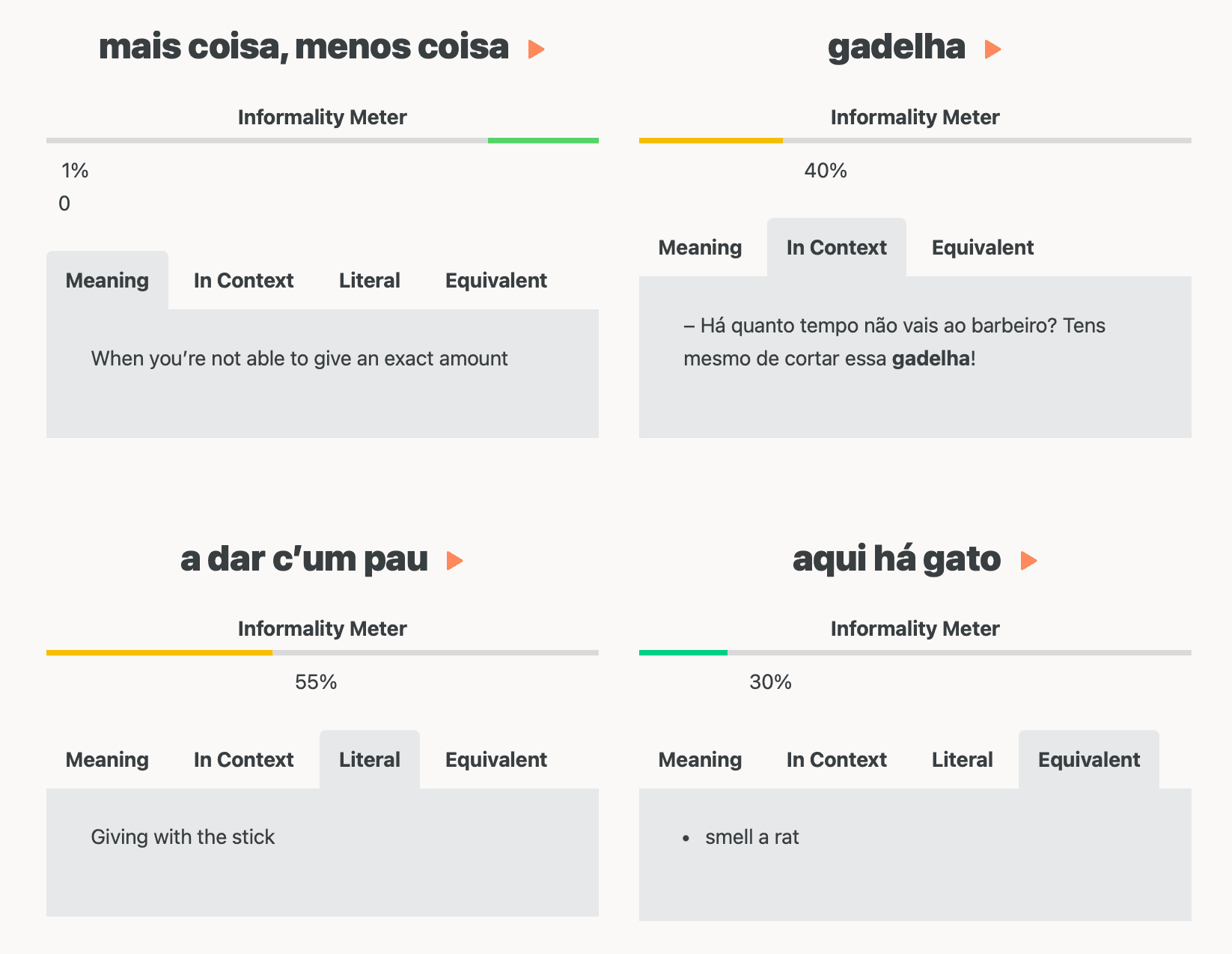 Throughout the lessons, you will be exposed to expressions like the ones in this article. You will also get access to a special idioms section on the site. Each includes the audio in European Portuguese, an English equivalent, a brief explanation, and usage examples. There is even a scale to show how informal or slang-like the expression is. This way, you will not only learn these sentences, but you will know how to apply them correctly. Click the link below to learn more!